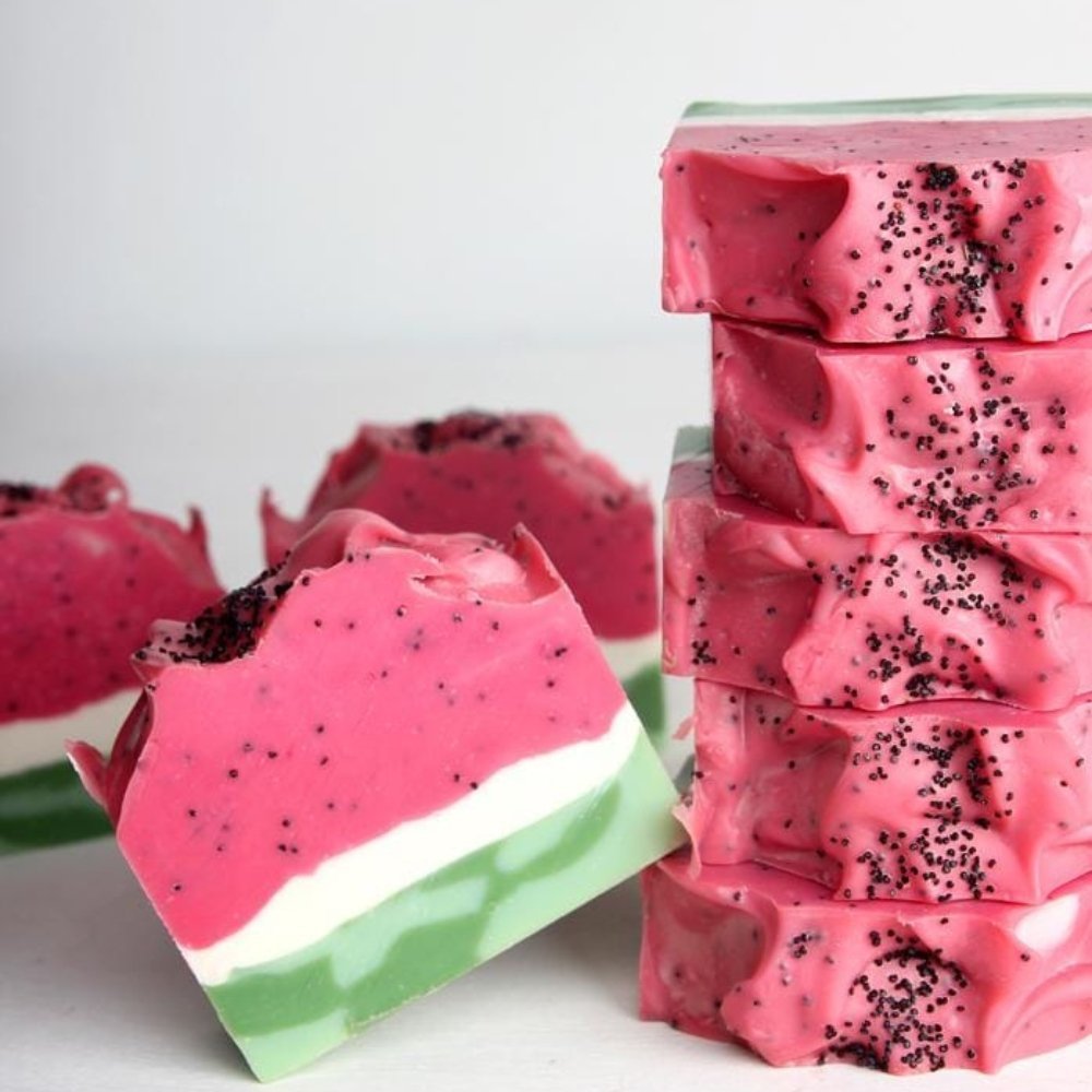 The vibrant pink and green layers, speckled with poppy seeds, mimic the delightful appearance of watermelon slices, making your shower time fun and invigorating.